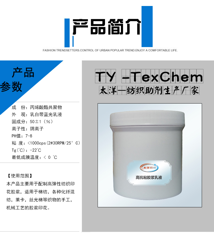 本品专为纺织印花行业研发而成的高弹力,高抗粘,具有特殊性能的丙烯酸酯合成环保乳液。在常温下干燥后表面不会再发粘,具有高抗回粘性。解决了困扰纺织印花行业多年印花后表面反粘的问题。