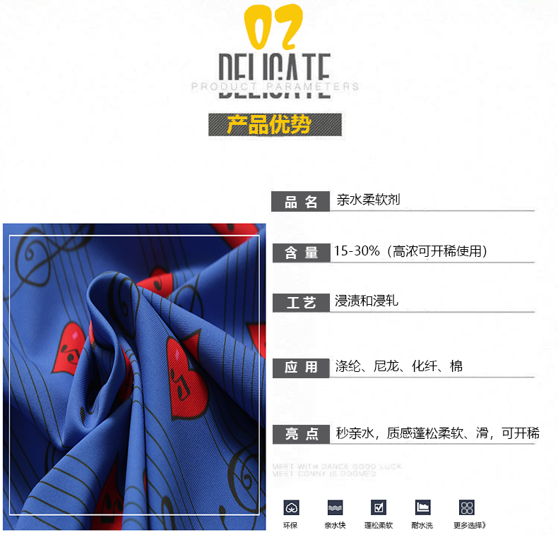 适用于涤纶、尼龙等化纤织物及其棉织物的亲水软滑整理。