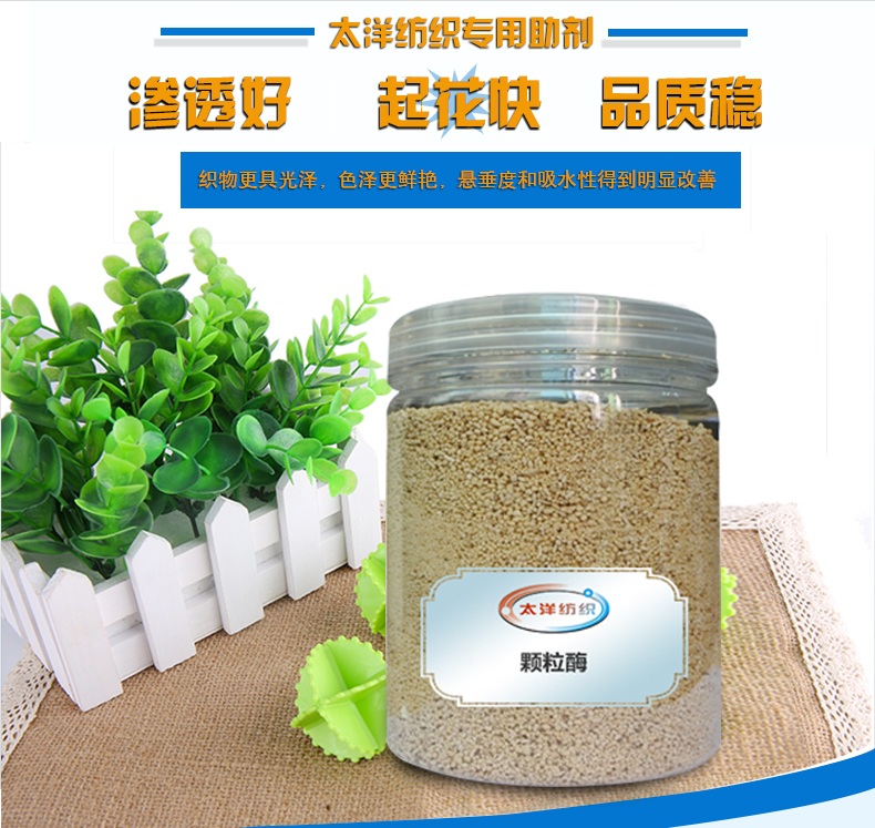 颗粒酶是一种经过基因改性的新型纤维素酶(内切葡聚糖酶),是一种多组分的复合绿色生态生物酶催化剂,能催化纤维素水解生成短纤维、纤维二糖、葡萄糖等。颗粒酶用于各类型酵素粉的复配。可用于成衣生物柔软整理和怀旧风格,毛羽去除效果;适用于牛仔服水洗工业,还可使各类纤维素纤维面料产生陈旧感。