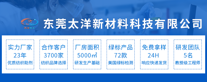 太洋纺织正式成立于1999年,坐落于广东省技术创新专业镇——东莞市黄江镇。自成立以来,公司就致力于纺织助剂的开发、生产和销售,开创了一个研产销一条龙的实力品牌。全国咨询热线:138-0982-0603