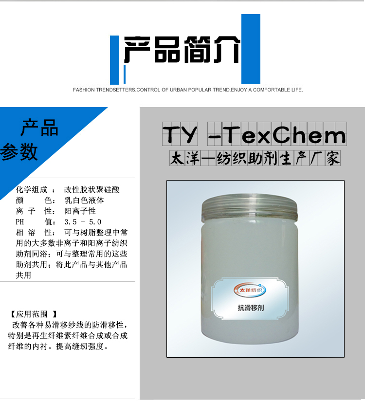 相溶性:可与树脂整理中常用的大多数非离子和阳离子纺织助剂同浴;可与整理常用的这些助剂共用;将此产品与其他产品共用时建议进行预先试验。